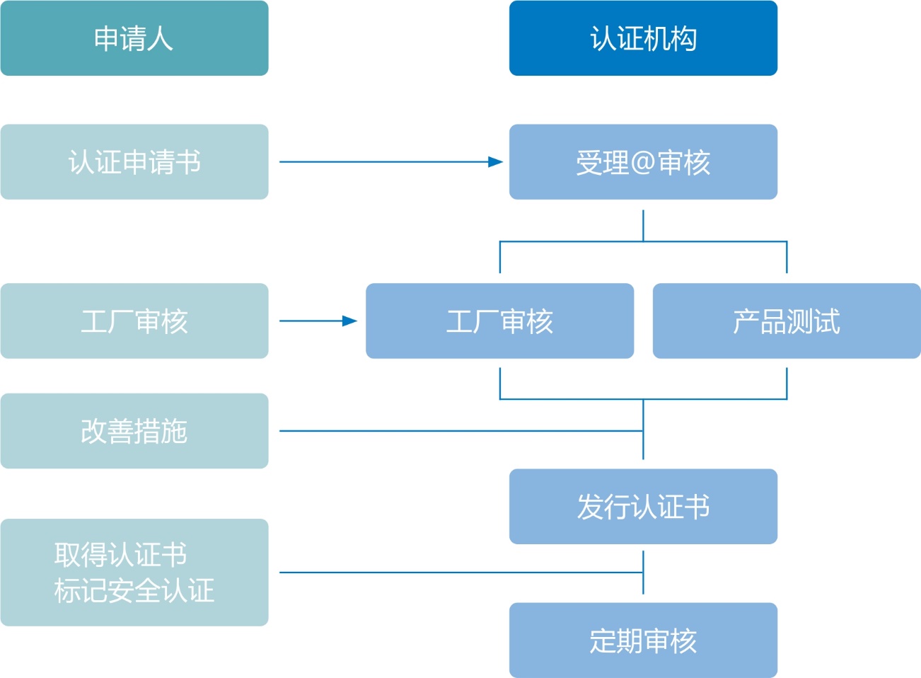 为确认企业是否持续保证已取得安全认证产品的安全性,要求对安全认证对象产品、生产设备、检测设备以及技术能力进行每2年1次的定期审核,定期审核包括工厂审核和产品测试,工厂审核时每个认证产品抽取1件代表型号进行产品测试。