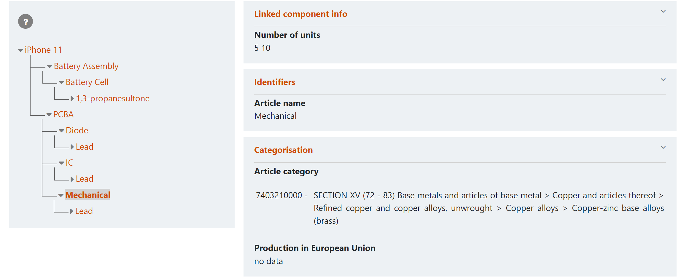 如下图显示,苹果公司的iPhone 11中,电池和PCBA中含有1,3-propanesultone和Lead超过了0.1%。
