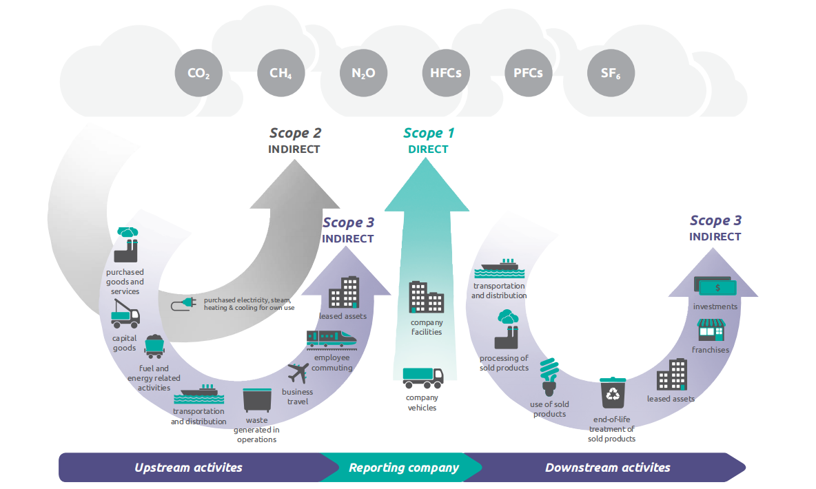 应用最为广泛的国际排放核算工具温室气体核算体系(GHG Protocol),将温室气体排放分为三类或三个“范围”: