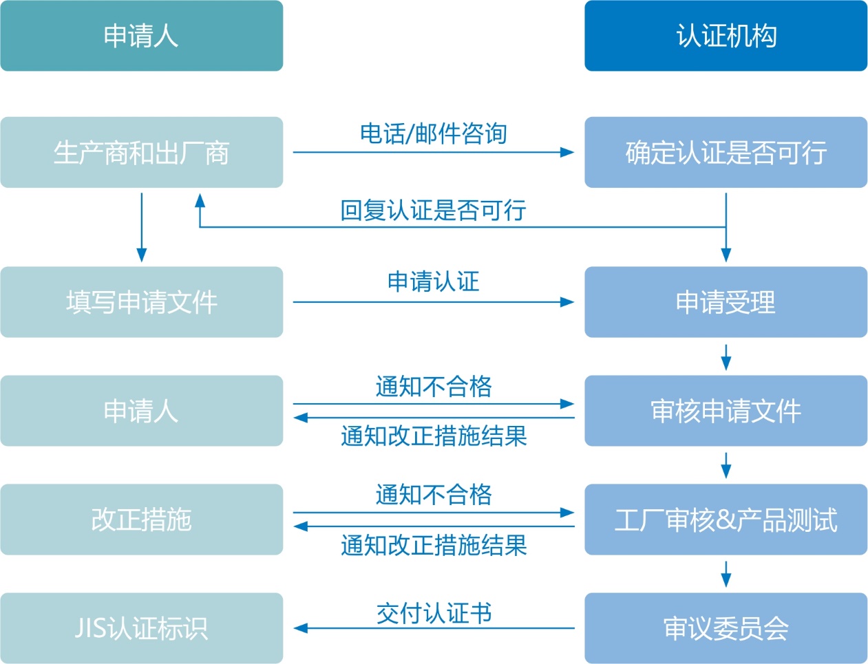 A:JIS认证周期可大致分为申请资料审核、工厂审核、产品测试3个部分,通常自申请资料受理之日起至工厂审核结束约60个工作日,产品测试周期因产品而异,不计入60天内;如工厂审核出现改正项目,改正周期除外;另外,企业接受咨询、准备资料的时间除外。