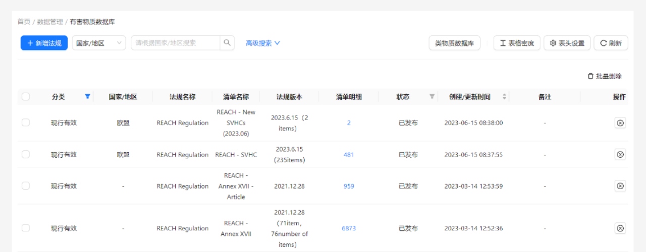 - 全球法规数据库:除过欧盟地区的法规数据库以外,瑞旭技术法规团队有专人深耕产品有害物质管控法规,目前已掌握的全球法规百余部。